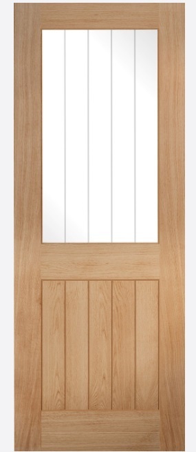 The ever so popular five vertical panel design showcasing geometry in unfinished oak has a modern twist on a traditional style with the added benefit of a clear glazing panel with frosted lines which replaces half of the unfinsihed oak to let the light shine through.