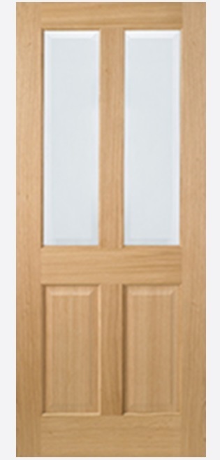 Two inset panels sit below two clear bevelled panels in this traditional pre-finished Oak door design.