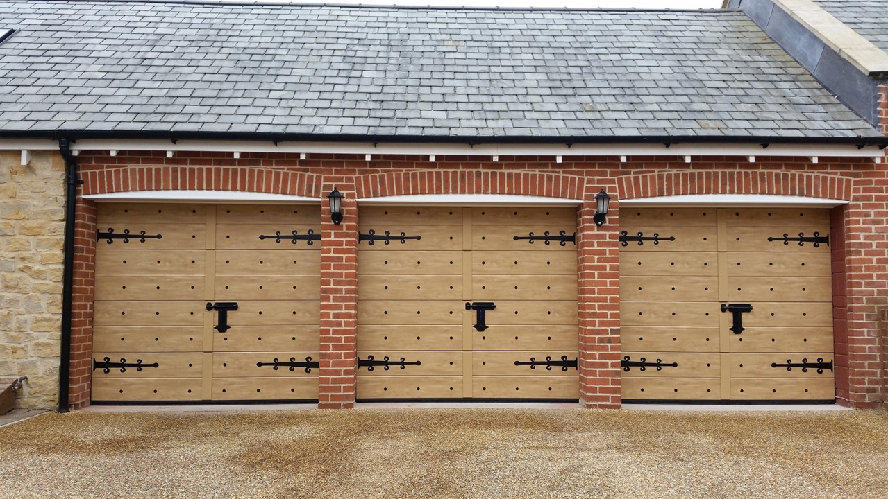 Modern garage door made to look like old one. Ribbed sections decorated with planks in woodgrain finish. Fitted with old style metal hinges and handles. All colour combinations available – just choose your favorite. Perfect option if you are renovating your countryside cottage and want to keep it’s old image but also gain convenience. Good solution In conservation areas where old garage door needs to be replaced but there are requirements to preserve curb appeal.