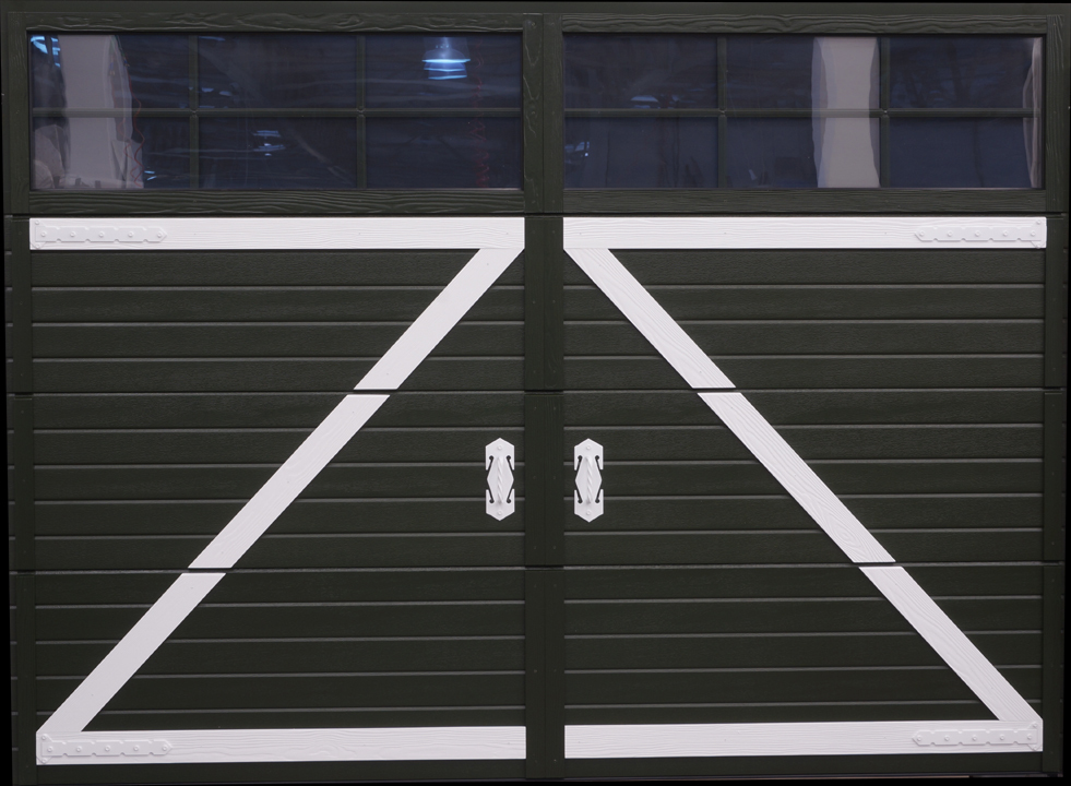 Modern garage door made to look like old one. Ribbed sections decorated with planks in woodgrain finish. Fitted with old style metal hinges and handles. All colour combinations available – just choose your favorite. Perfect option if you are renovating your countryside cottage and want to keep it’s old image but also gain convenience. Good solution In conservation areas where old garage door needs to be replaced but there are requirements to preserve curb appeal.