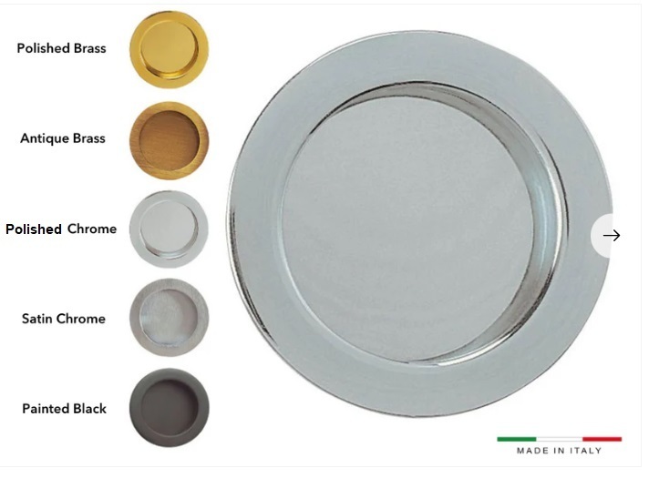 Made in Italy, these contemporary flush pulls provide the perfect finishing touch for your pocket door and come in a variety of finishes. The set includes two handles plus a handy finger pull for use in the leading edge of door. Matching bathroom/privacy locks are available.