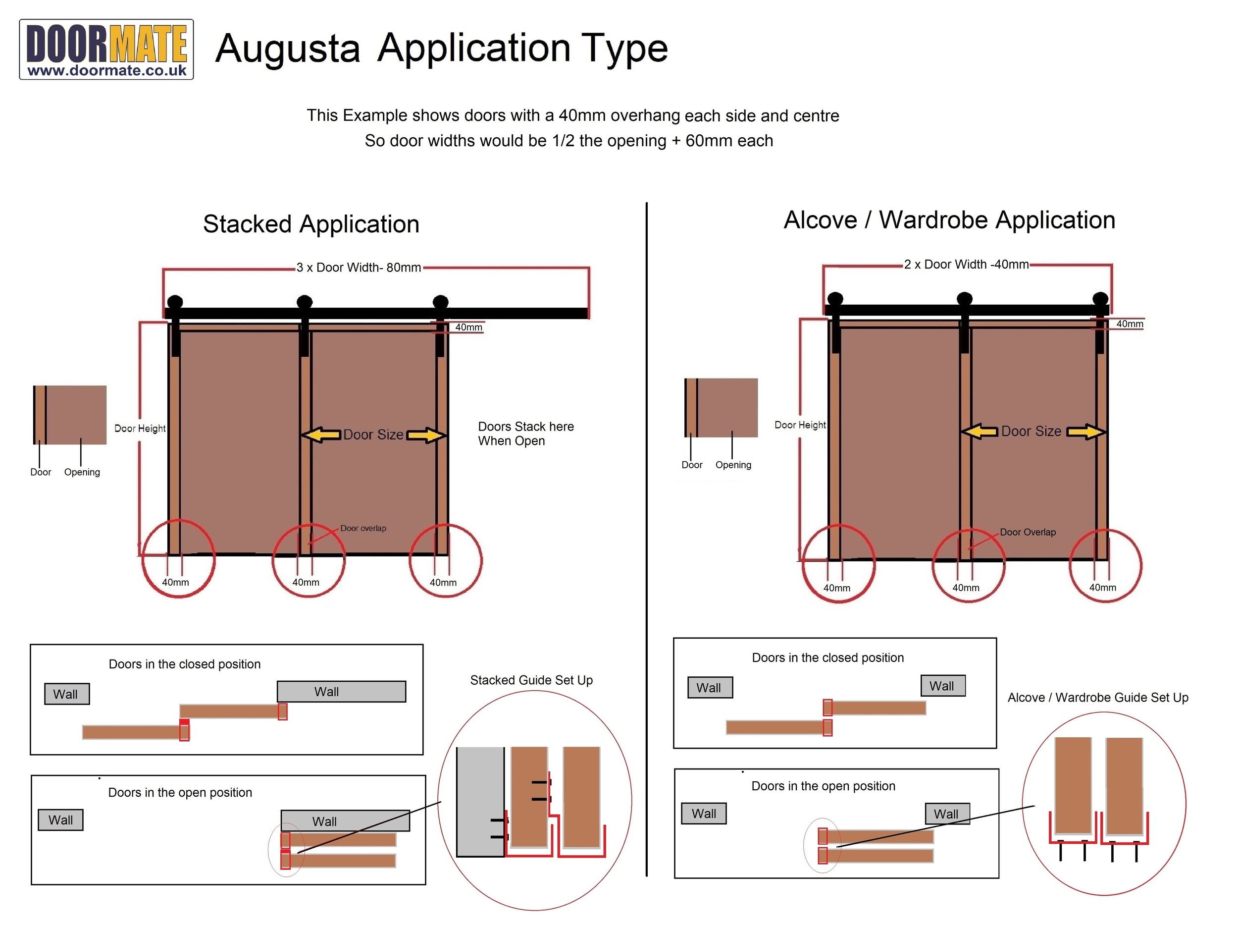 The Augusta is an efficient option when tight on wall space, you have a double structural opening and only short or single wall space to house the doors this system allows 2 doors to pass each and stack up to single door size. with the ability to slide one door over another makes the Augusta Double door hardware effective for wardrobes, pantry’s its bulky design gives it a real rustic industrial appearance, tho we make the kit as DIY friendly as possible its perhaps not for the new DIY’ers as can often require onsite adjustments