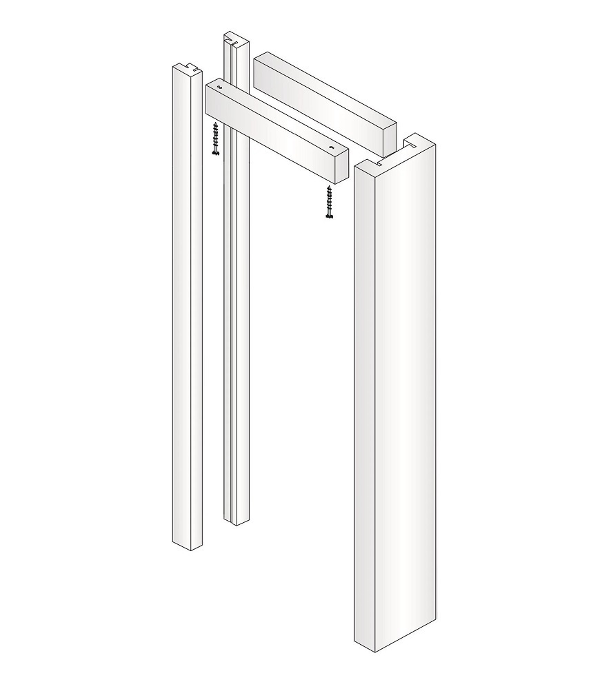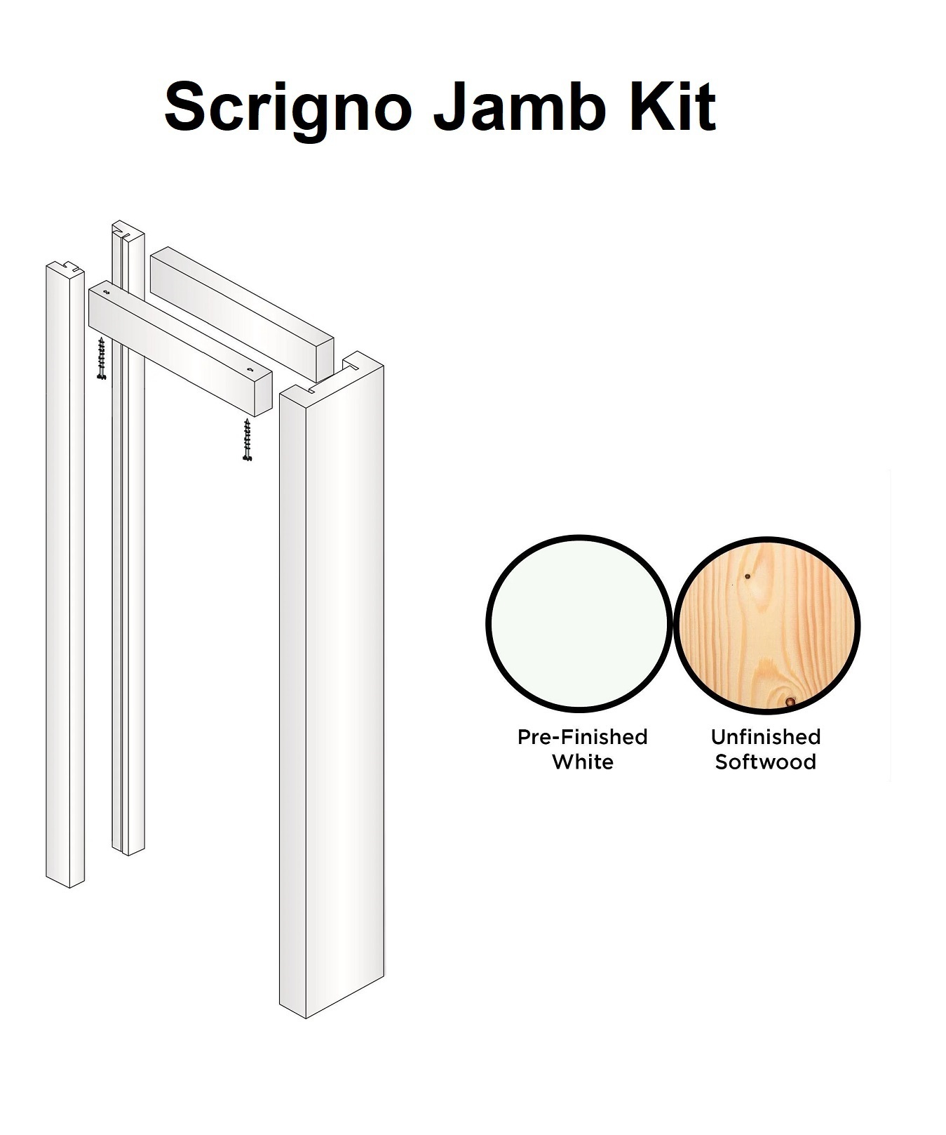 The Scrigno Jamb Kit is a set of components that are used to finish the edges of a pocket door opening. The kit includes two jambs, two side panels, and a top rail. The jambs are made of a durable MDF material and can be left unfinished or pre-finished in white.Jamb Kit Colour Options